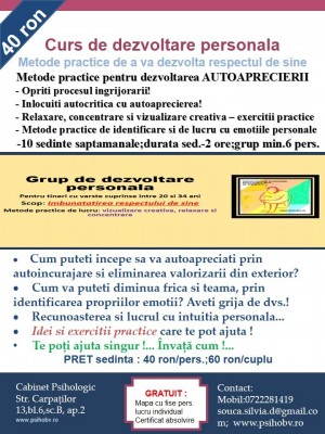 In perioada 1-9 martie doresc sa formez un grup de dezvoltare personala al carui scop este acela de a imbunatati increderea in sine. Invitatia se adreseaza tinerilor cu varste cuprinse intre 20 si 34 de ani, aferenta perioadei de formare a adultului tanar. Dezvoltarea emotionala armonioasa este extrem de importanta acum la debutul vietii personale si profesionale!